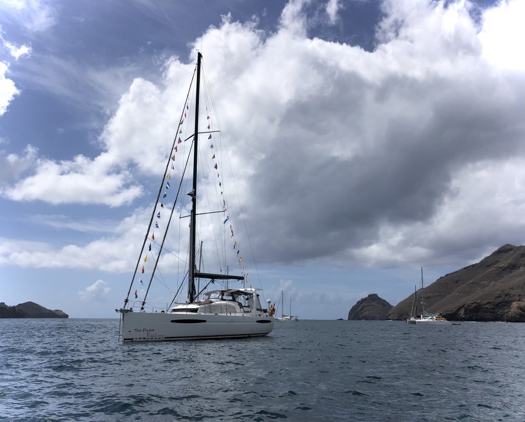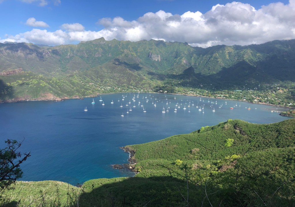 Elvira at anchor in Taiohae bay, Nuku Hiva, Marquesas, French Polynesia