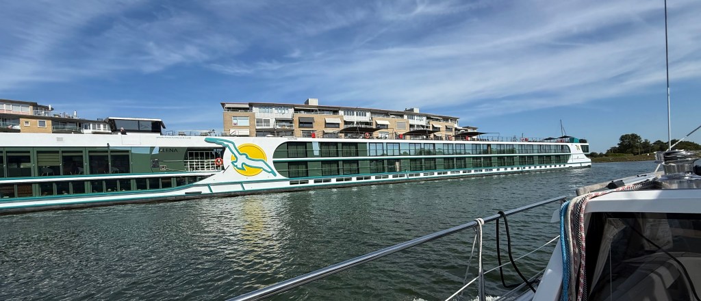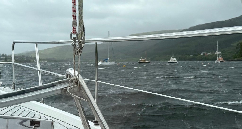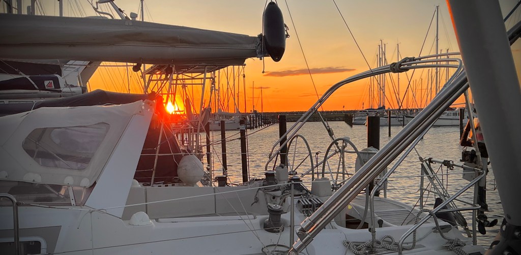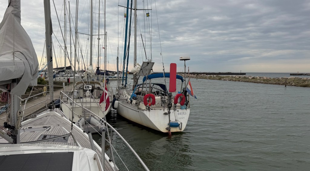 I skrivande stund, vid 13-tiden, tar vindbyarna tag i masten och kränger Panta Rhei lekande lätt från sida till sida. Vi ligger tryggt och bra i lä av betongkajen och har förtöjt båten med gummihulkar. Vindprognosen varnar för vindbyar på 21 m/s…