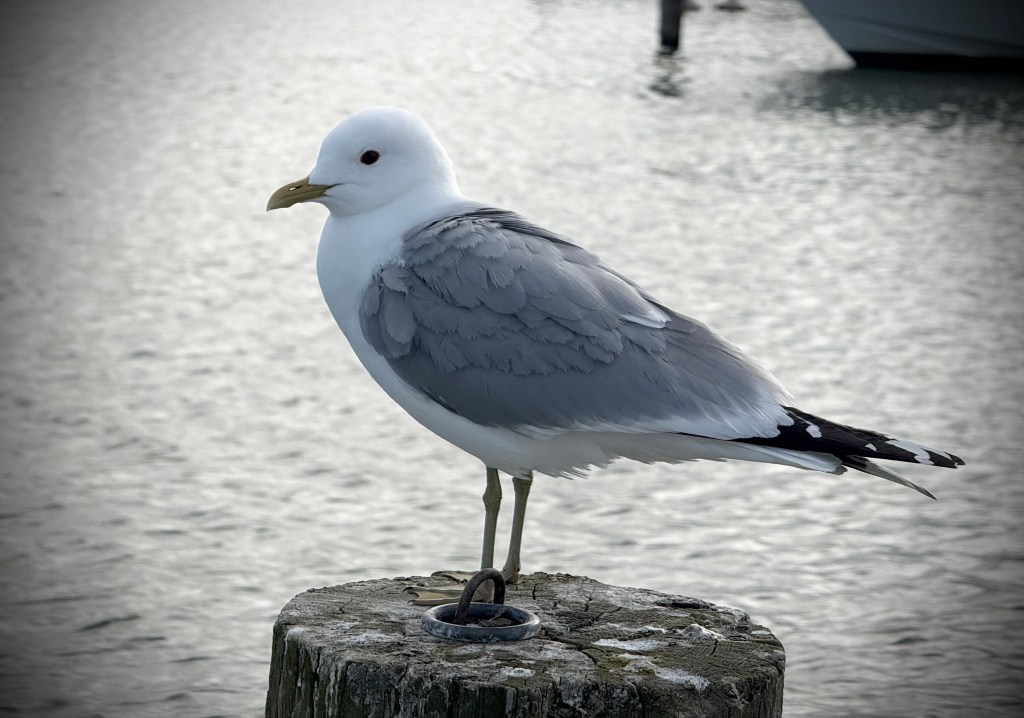 Denna mås har tagit emot oss varje gång vi kommit till båten. Den sitter på akterstolpen, endast en meter från båten. Vi kan även konstatera att den suttit på segelkapellet. Stora blaffor som vi skyndsamt tvättar bort… suck…