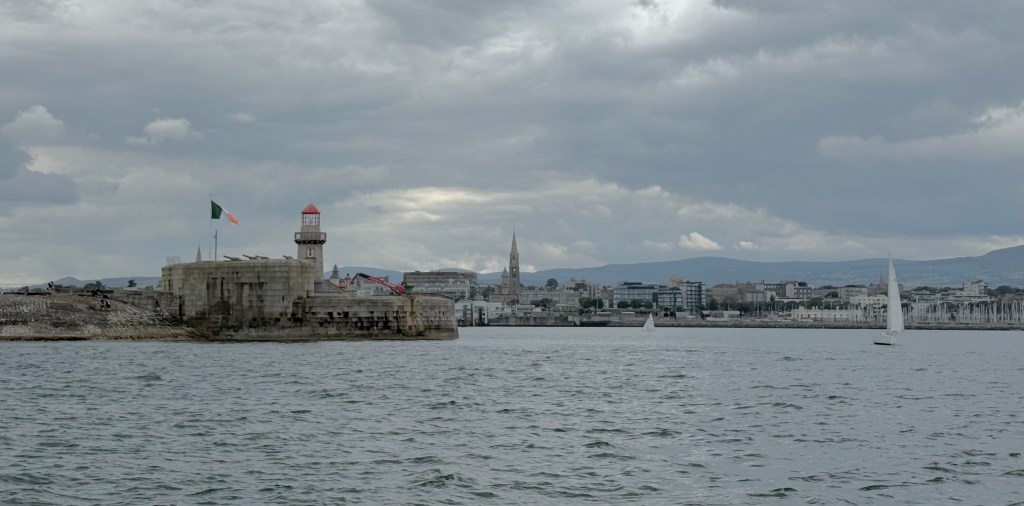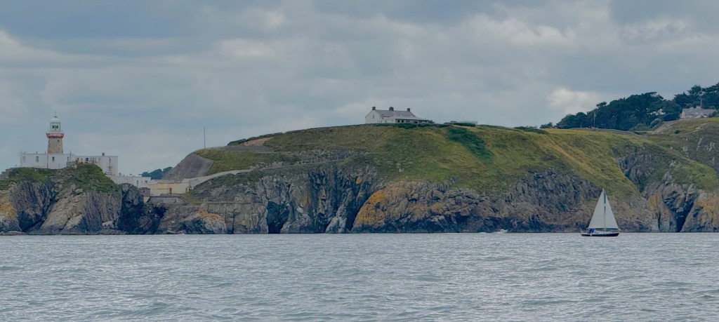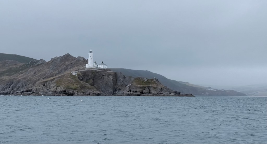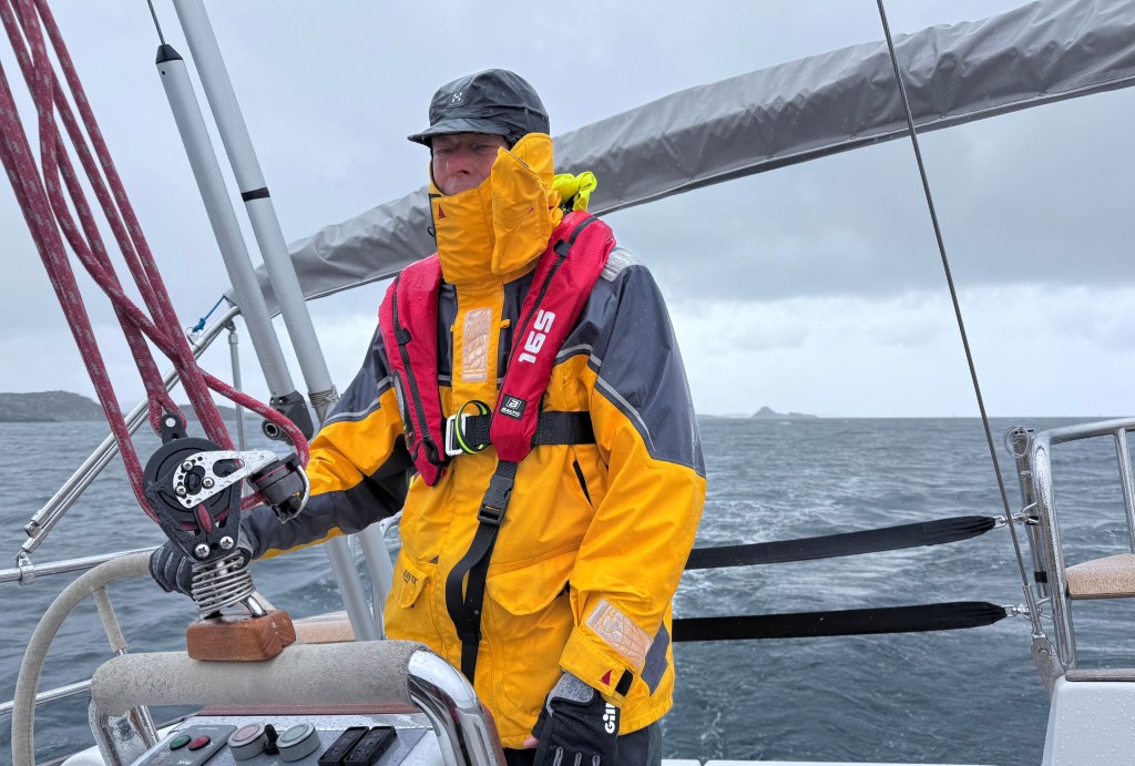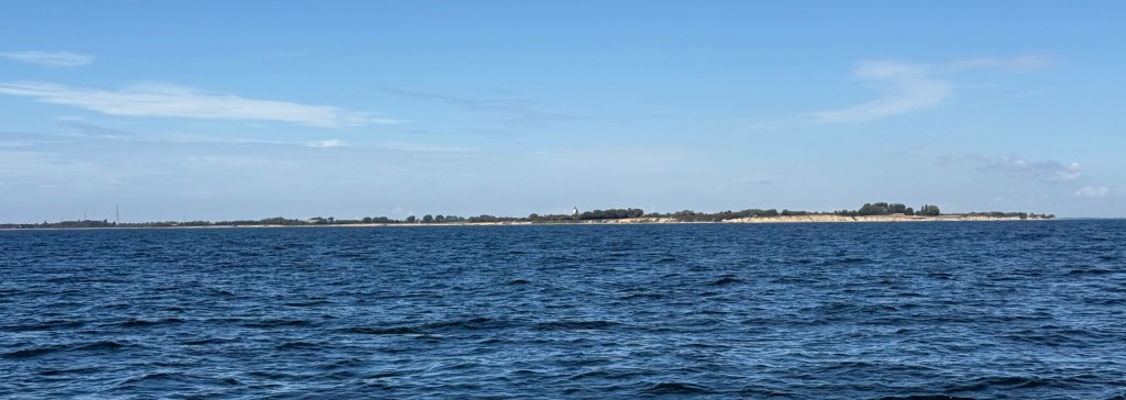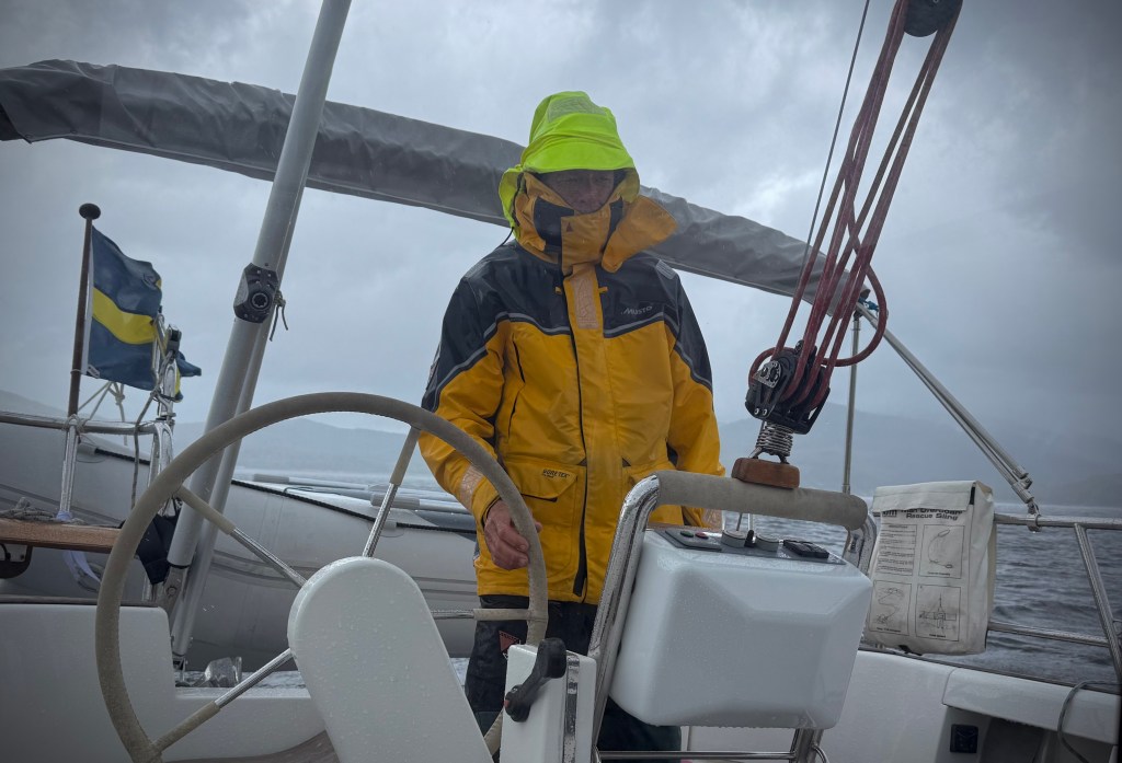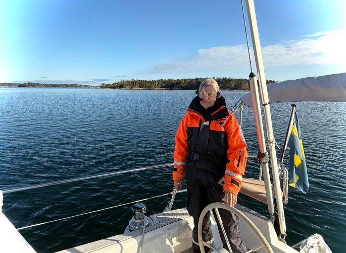 Efter en lugn natt och sovmorgon kom vi iväg innan sju. Svag undanvind utlovad och då är det ju dumt att ligga och dra sig. Frukost tar vi då vi kastat loss. Det är ingen sommarvärme. Sex grader, vilket gjorde klädvalet enkelt. Flytoveraller…