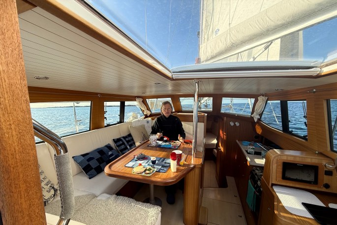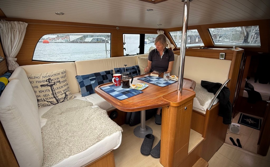 Klockan har passerat 21 och solen har precis gått ned, vilket även känns i salongen. Ute är det 6.2 grader, samma som i havet. Dags att slå på värmaren…