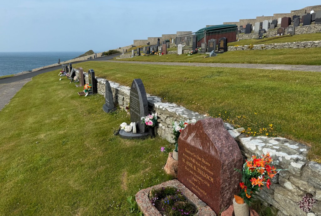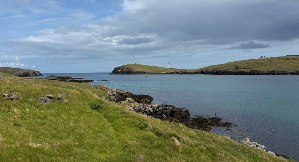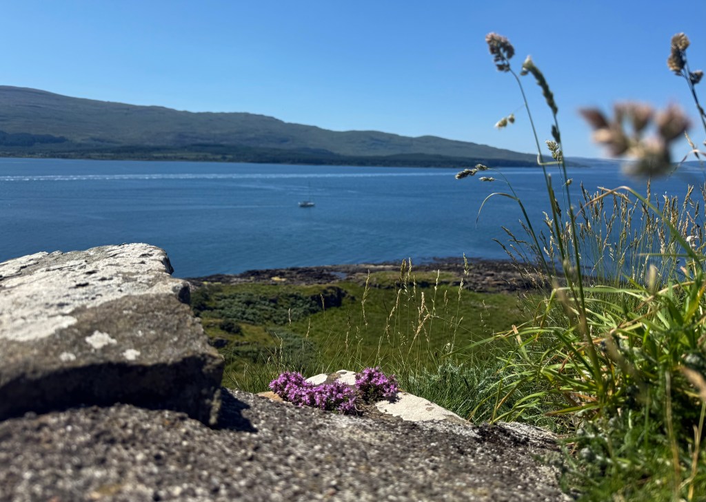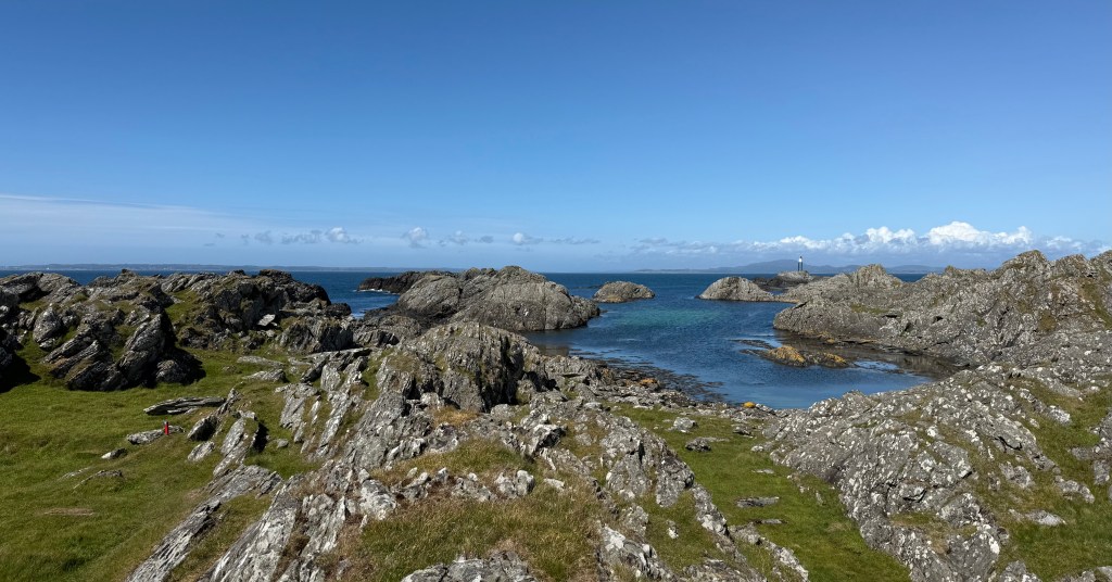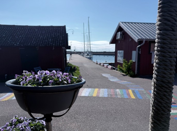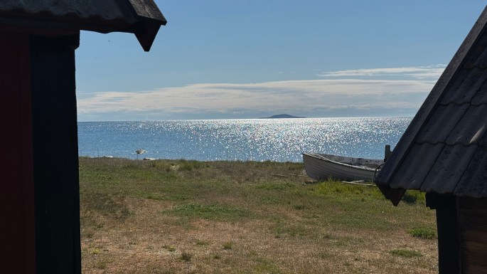 Skönt med en promenad efter seglingen. Mellan stugorna syns Blå Jungfrun, i Kalmarsund. Den ön syns på långt håll, med sin höjd på 86 meter.