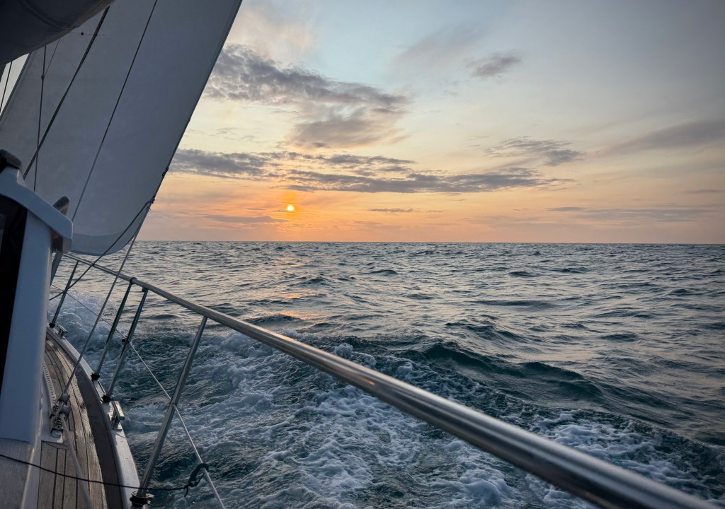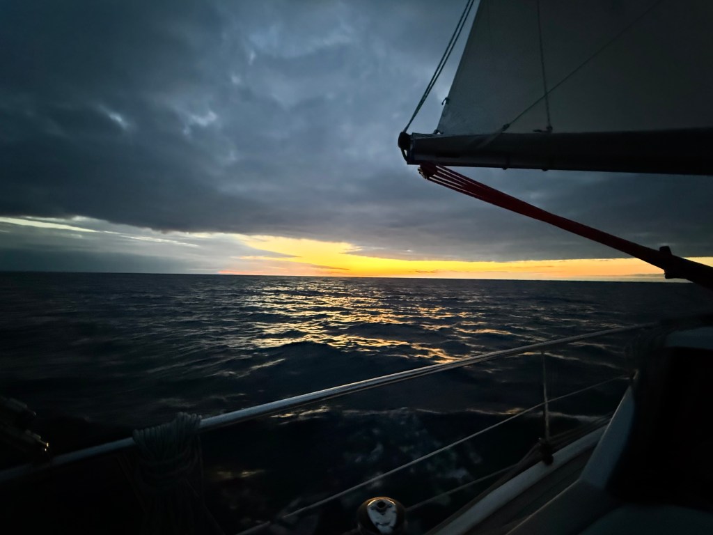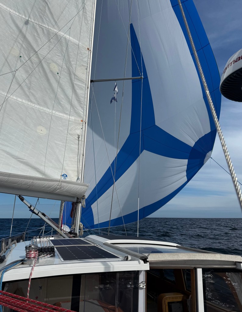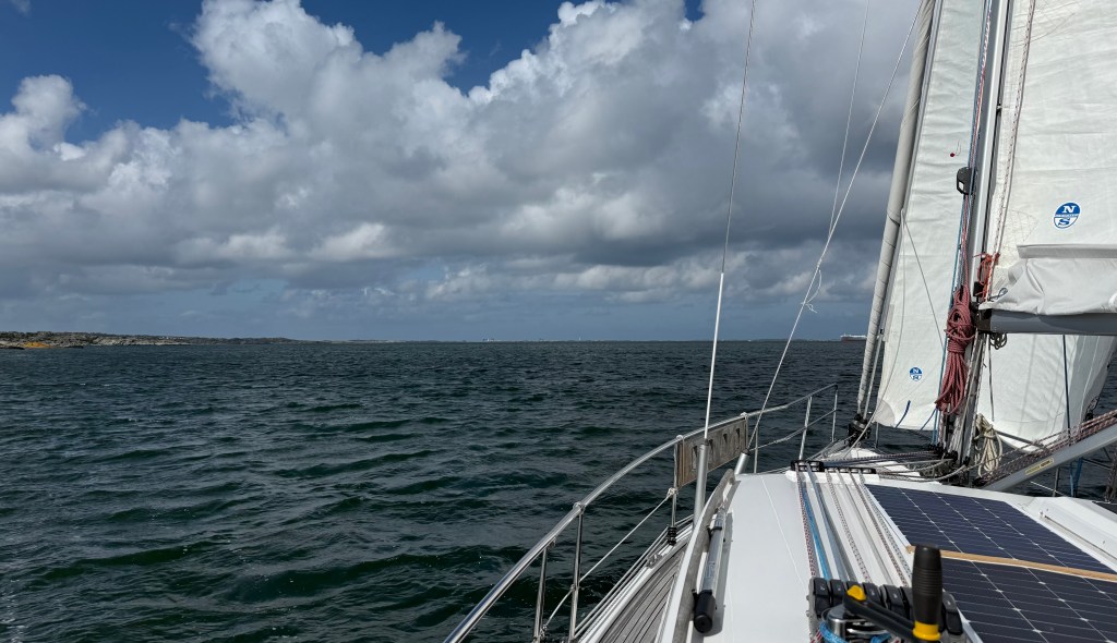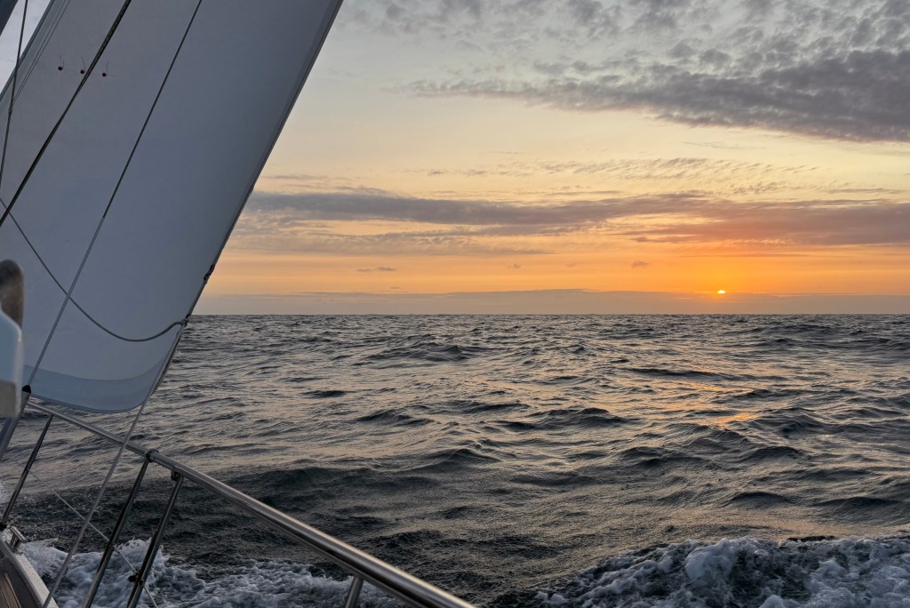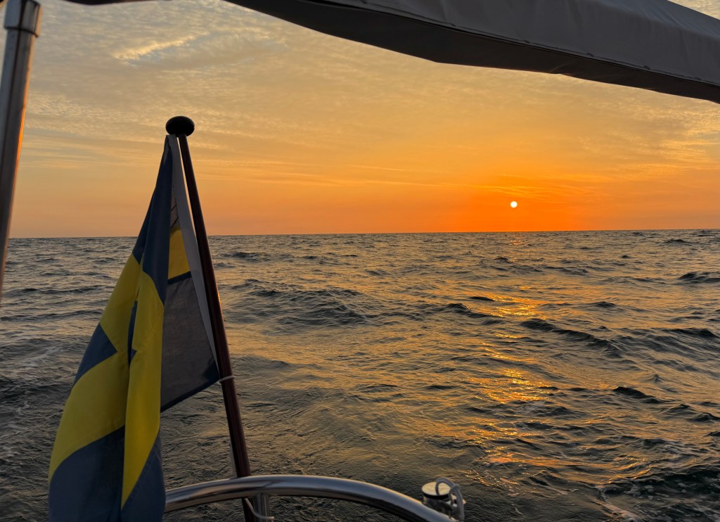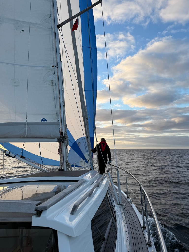 Vi seglade på öppet hav, kortaste spåret, och hoppades att dyningen inte skulle stöka till det i den modesta undanvinden. Allt gick över förväntan och vindprognosen stämde inte med verkligheten, vilket vi tacksamt noterade…
