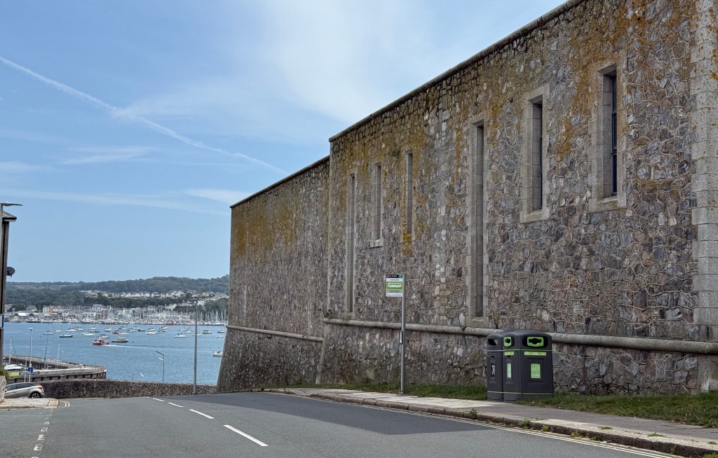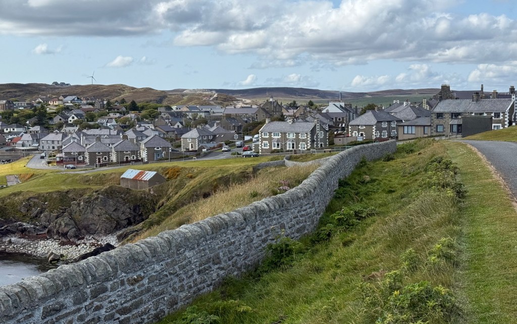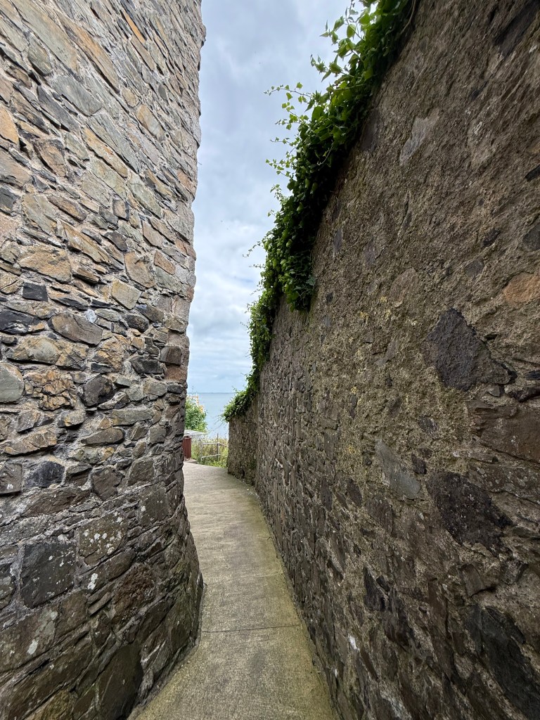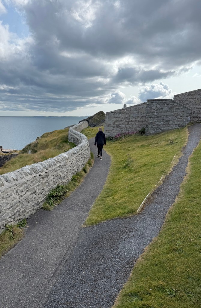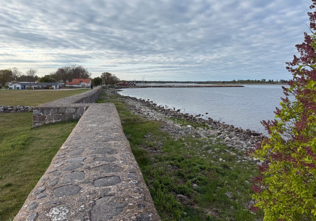 Muren byggdes mellan 1603-1606 av danskar, då det begav sig. Den är tre kilometer lång. Hitta Kibben i övre bilden. Hamnen syns bakom vågbrytaren. Tidig fyr på bilden nedan.