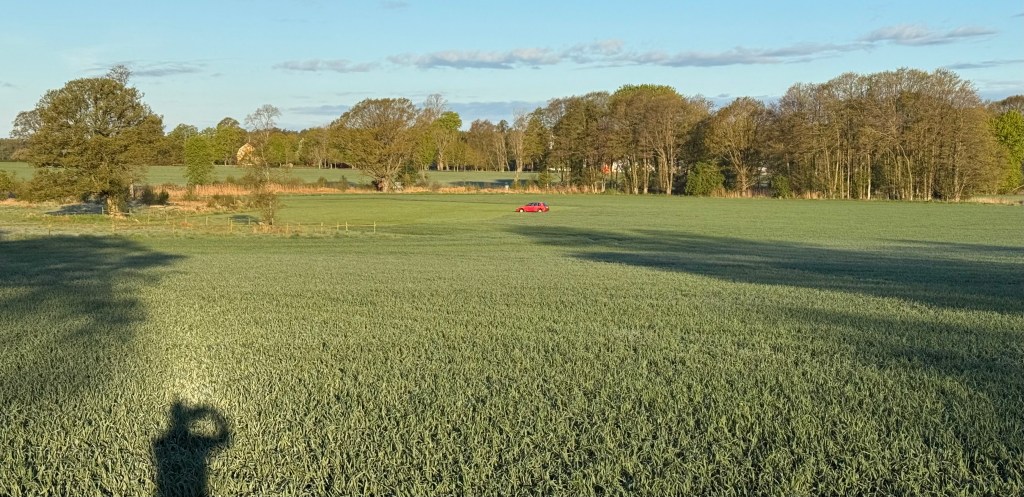 Regnet ska komma vid niotiden. Vinden har redan ökat. Vi stannar kvar i Flatvarp och förstår att det kommer att bli en innesittardag. Därför är morgonpromenaden extra viktig. Ut i blåsten!