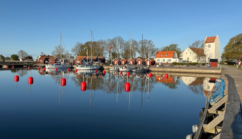 Våra grannbåtar lämnade allt eftersom. Det blev tyst och stilla. Endast fågelsången ljöd över oss, speciellt lärkan, samt vågornas dova slut mot klipporna utanför pirarmarna… Det varade en stund men därefter kom en öppen, mindre rib-båt, in med tre snubbar. Enligt tillsyningsmännen, som också brummade in i hamnen, hade gummibåten startat i Malmö och besökt intressanta platser längs vägen. Närmast kom de från Karlskrona och skulle Vidare upp mot Kalmar…