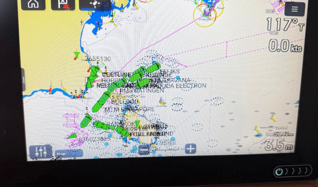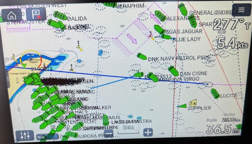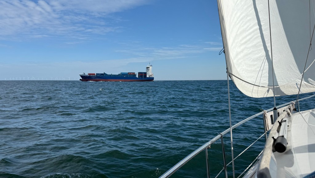 Vårt färdspår fick en liten ”knick” då vinden åter lugnade ned sig. Det stora tonnaget håller till i trafikkorridoren mellan fastlandet och Bornholm.