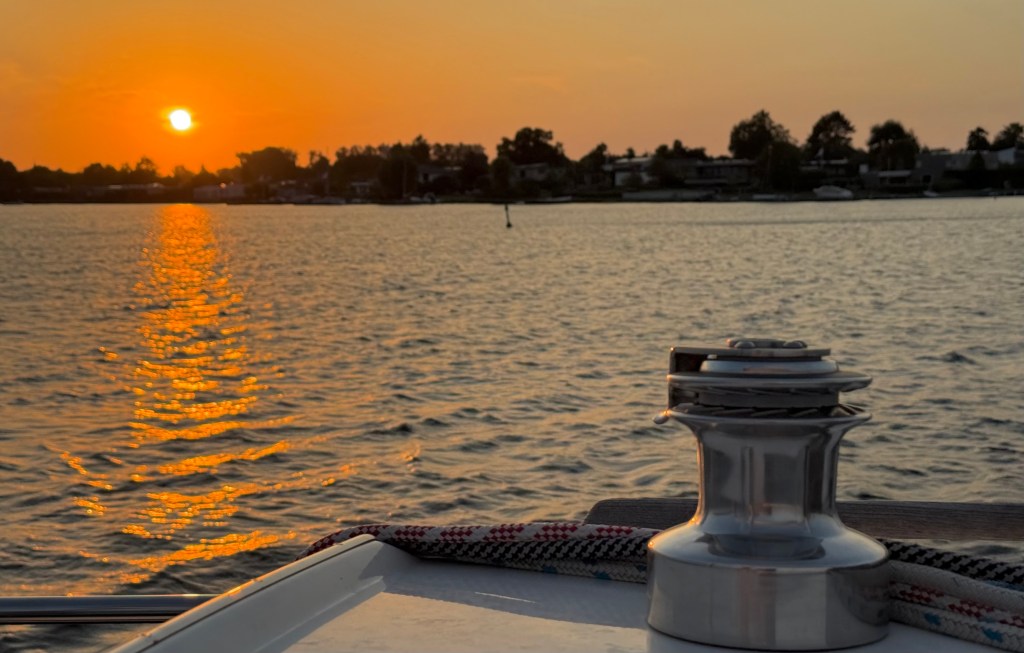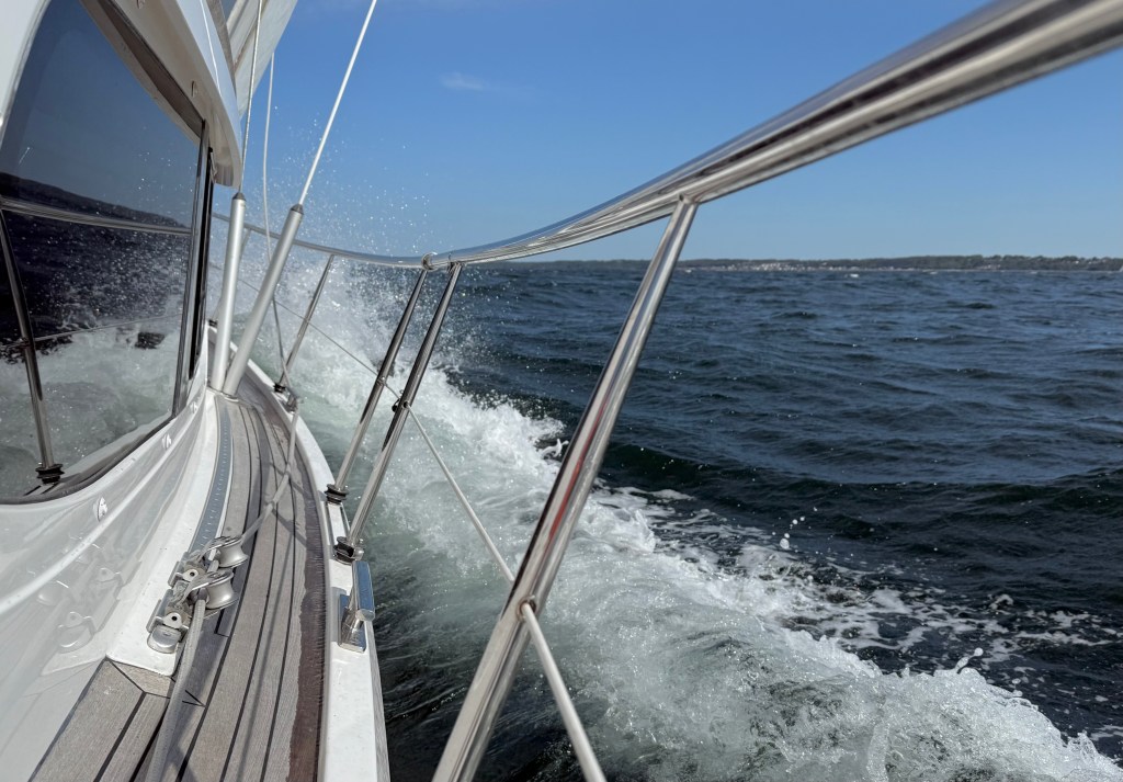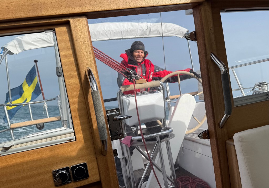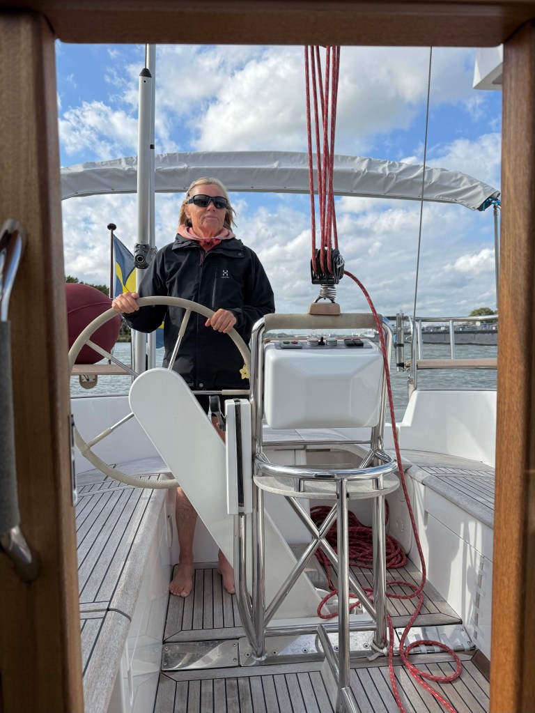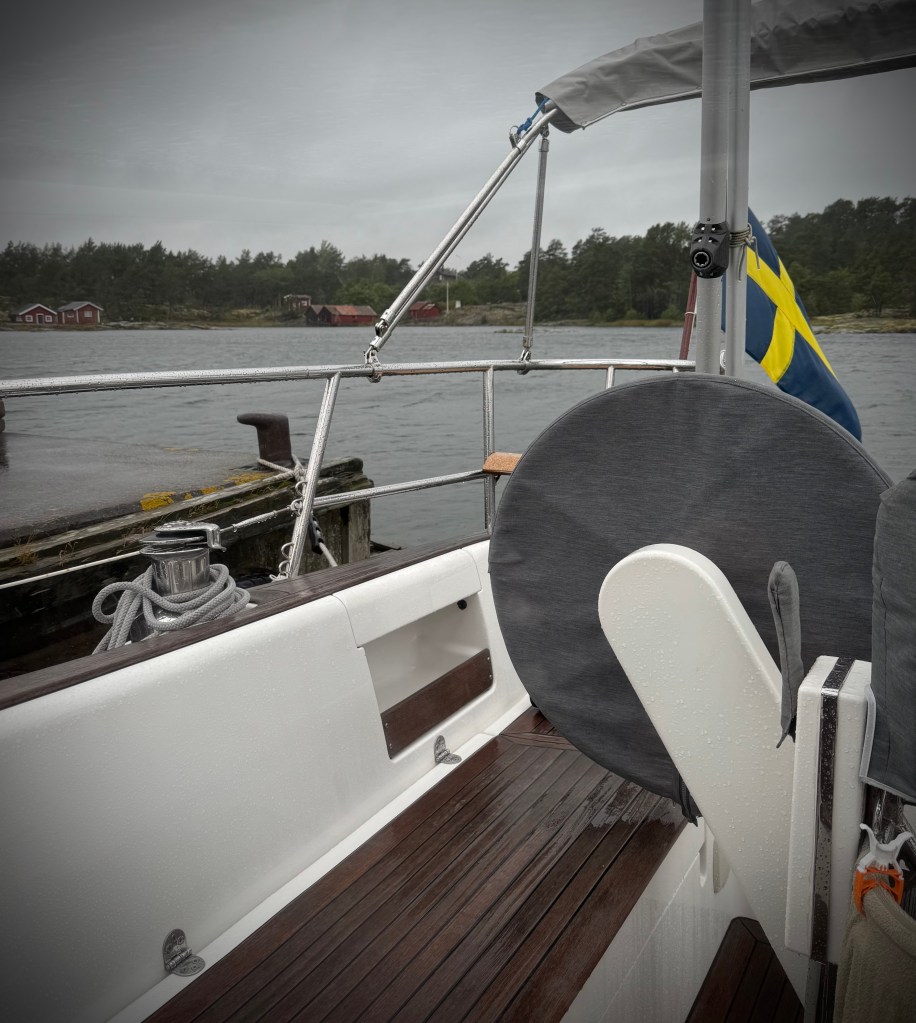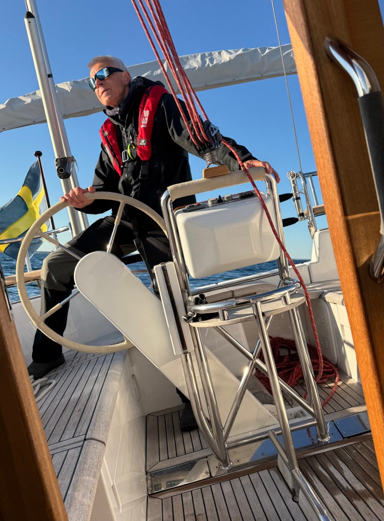 Hittills flödar solen över oss. Vinden har ökat till närmare 10 m/s. Kommer att bli en snabb segling över Bråviken. Rodret gör sig påmint om glappande, dunkande ljud. Inte bra… Inte alls bra…