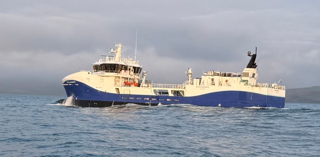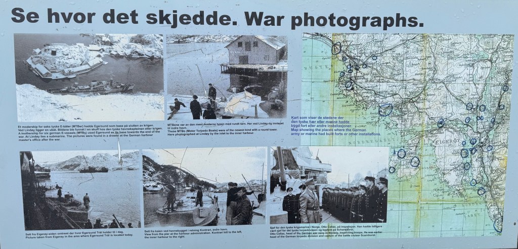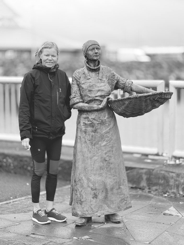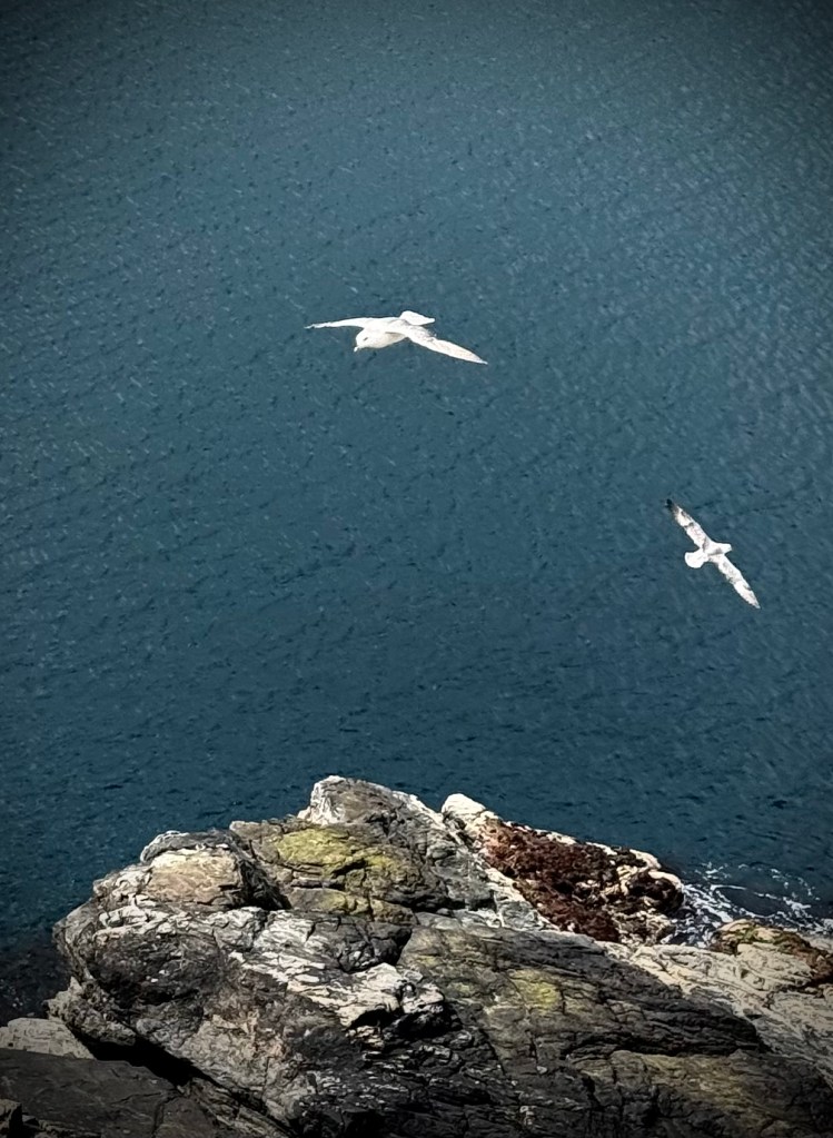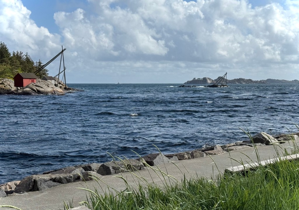 Vinden och den stora dyningen döljer sig bakom klippan. Bruset hörs tydligt. Hamnens släta vattenspegel ligger fortfarande i sömn. En lång dag på havet väntar oss. ”Freja”, den blå båten, träffade vi i Harstad, Norge 2022. Hon seglar under Schweizisk flagg.