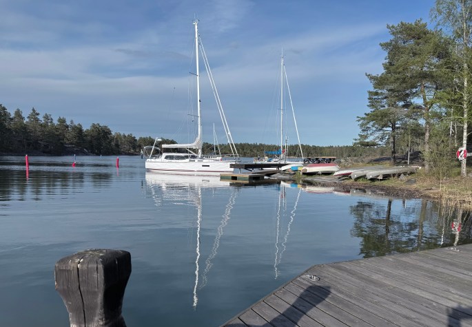 Efter 47 M (nautiska mil) förtöjde vi mot Kryssarklubbens brygga på Stora Ålö. Iskalla sjömil eftersom vattentemperaturen låg på 6.8 grader C och luften ca 12 grader. Kylan suger kraft… men i salongen där vi tillbringade halva tiden, var det drygt 20 grader tack vare solen. I övrigt en gynnsam och bekväm seglingsdag…