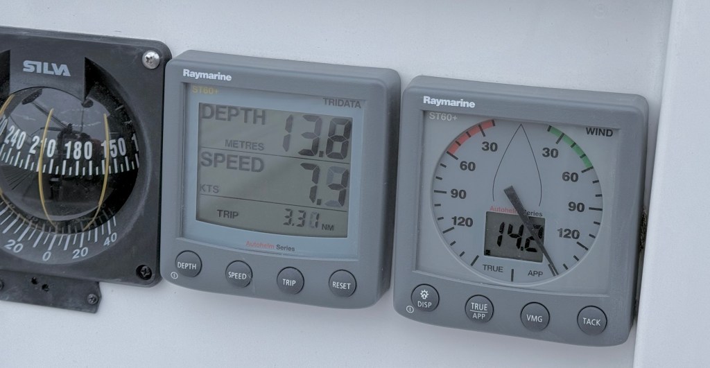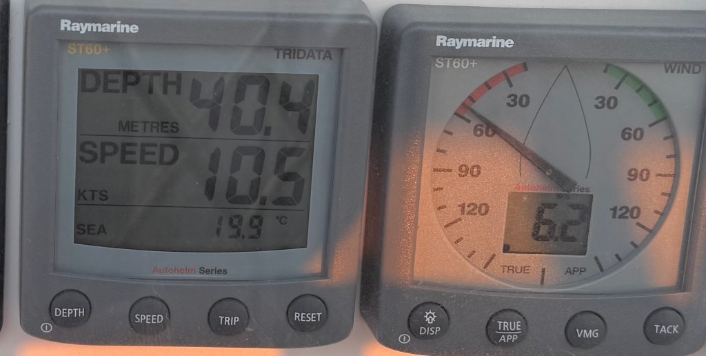 Dessbättre återkom vinden och det rejält. Toppnoteringen blev 10.2 knop i ”nedförsbacke”.