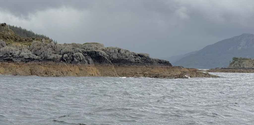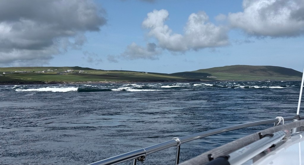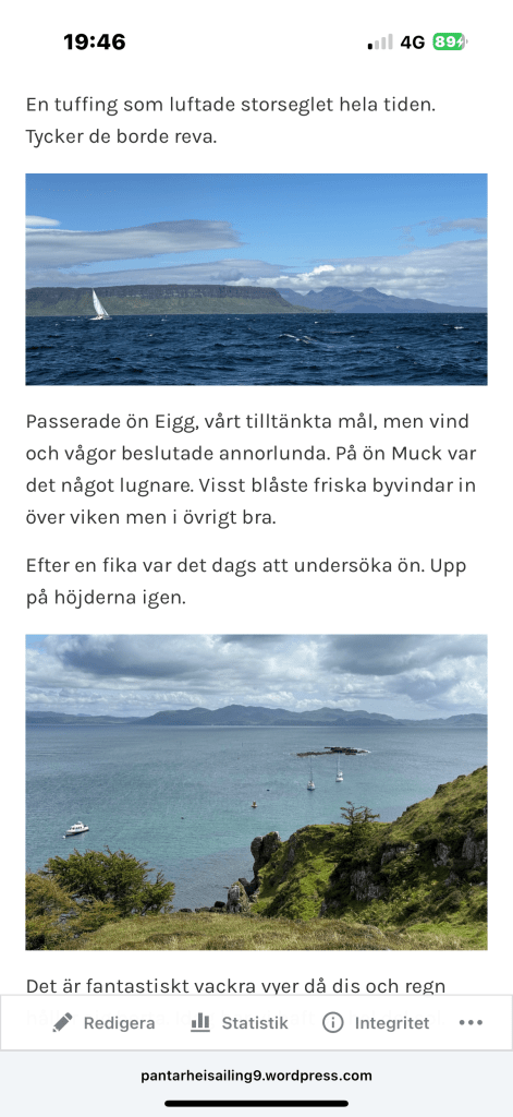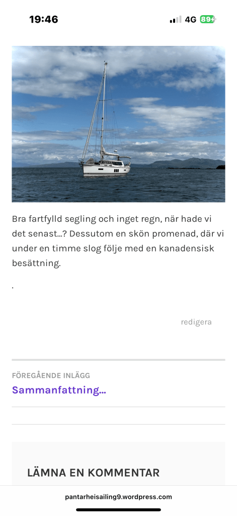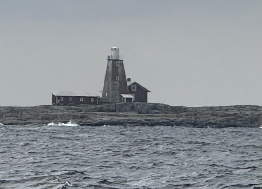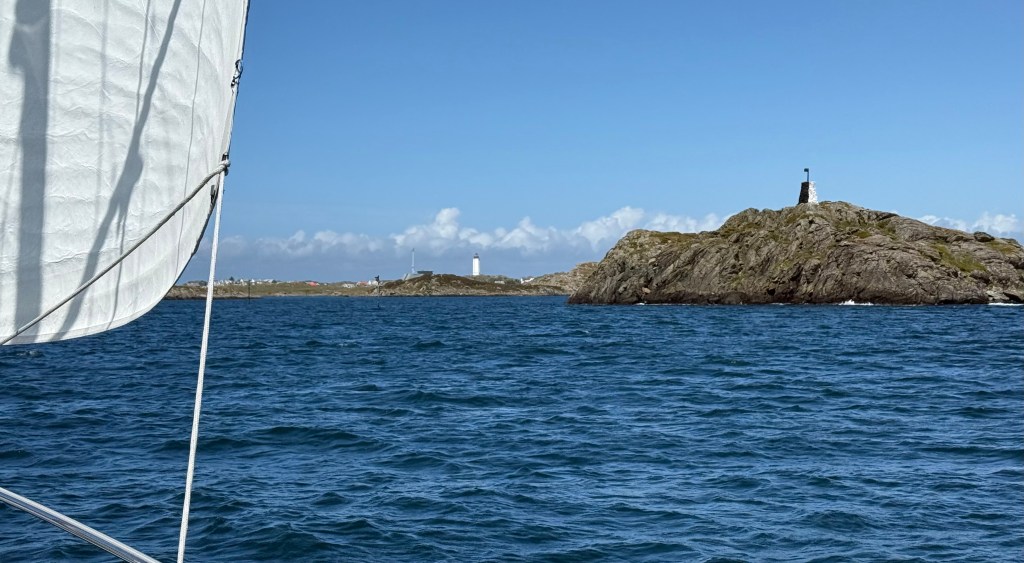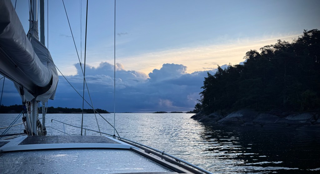 Därför var det en stor lättnad att segla in i den skyddande skärgården. Glida fram utan rullande och slående segel… Dyningen hördes ryta mot klippor och skär, när de kraschade utanför vår trygga farled (Rorsman, som var lite ”pist of” lipade åt de döende vågorna. Lite omoget kan det te sig).