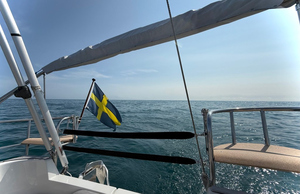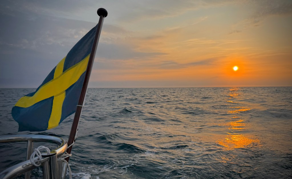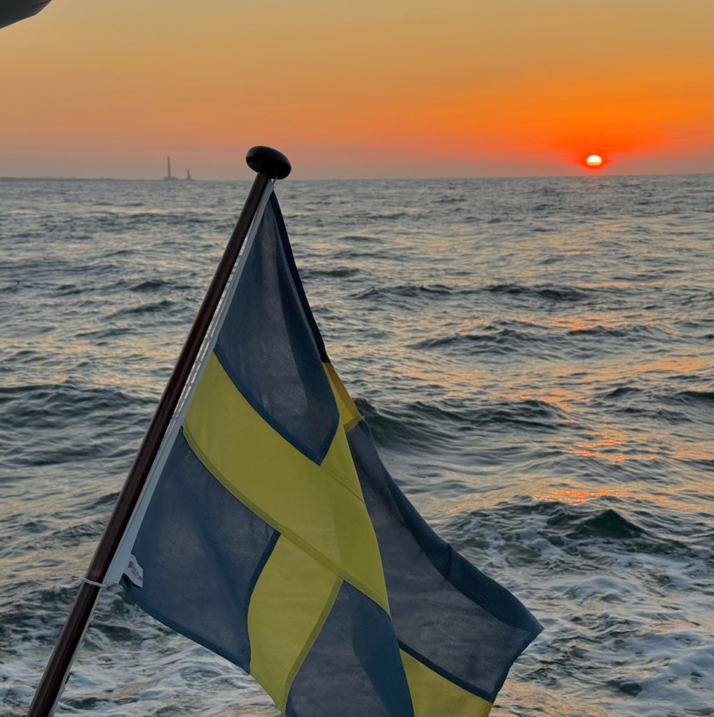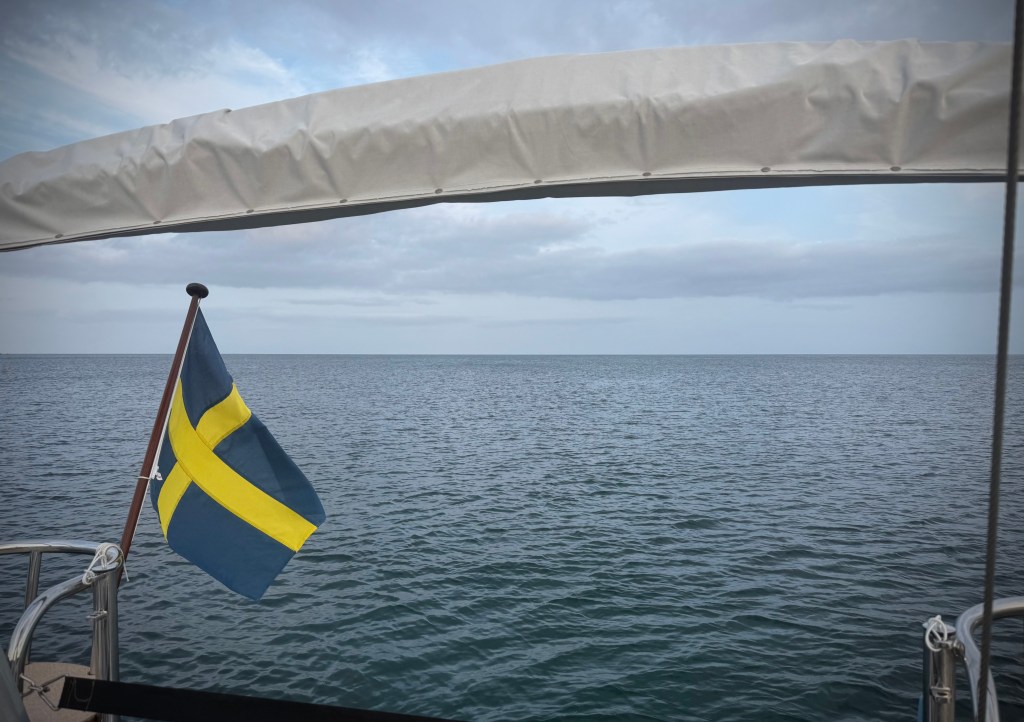 Den svenska flaggan ska vi med glädje visa upp i de utländska hamnar vi besöker. Undrar hur länge vi kommer att behöva flytoverallerna mot kylan…?