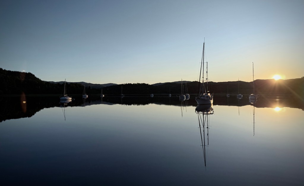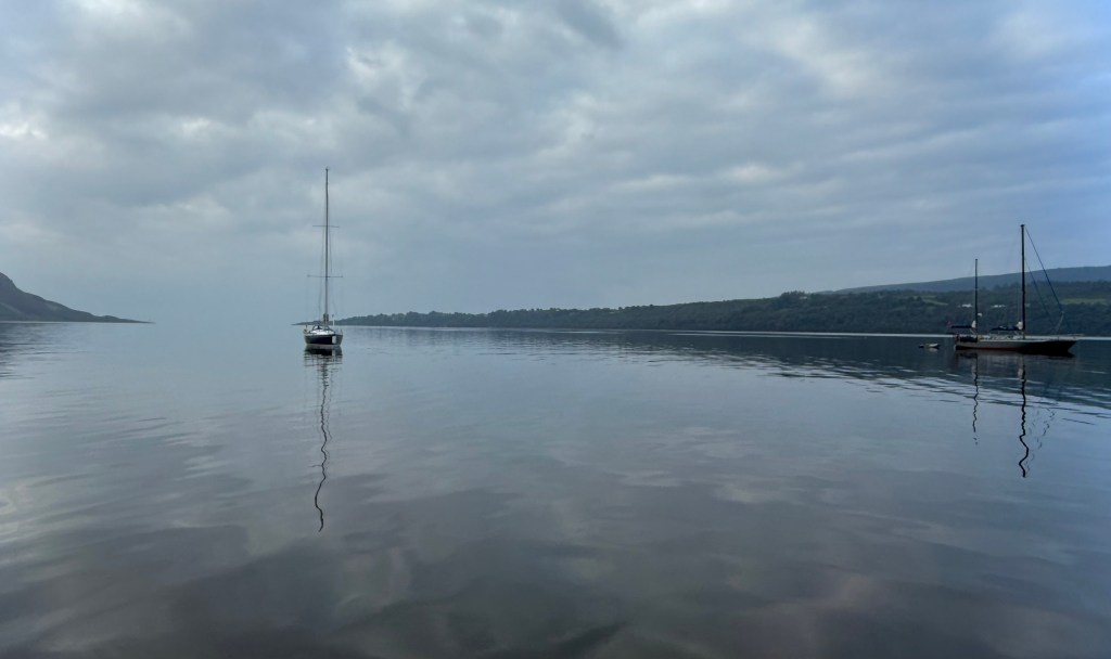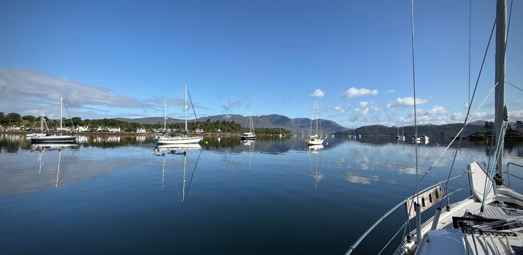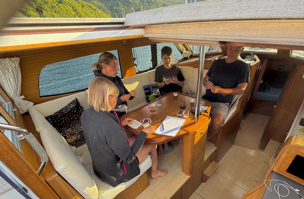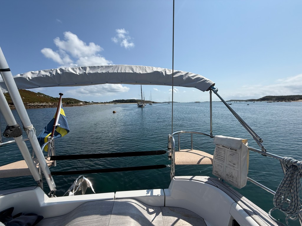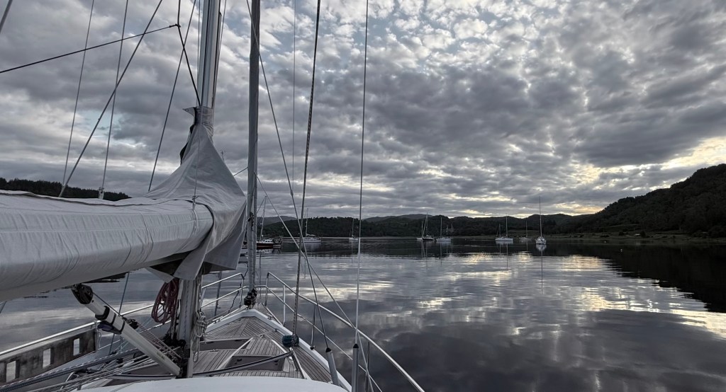 Ankrar på fyra meters djup och kliver in i den soluppvärmda salongen… Dags för ”a nice cup of tea”. Första etappen avklarad. Tid att softa…