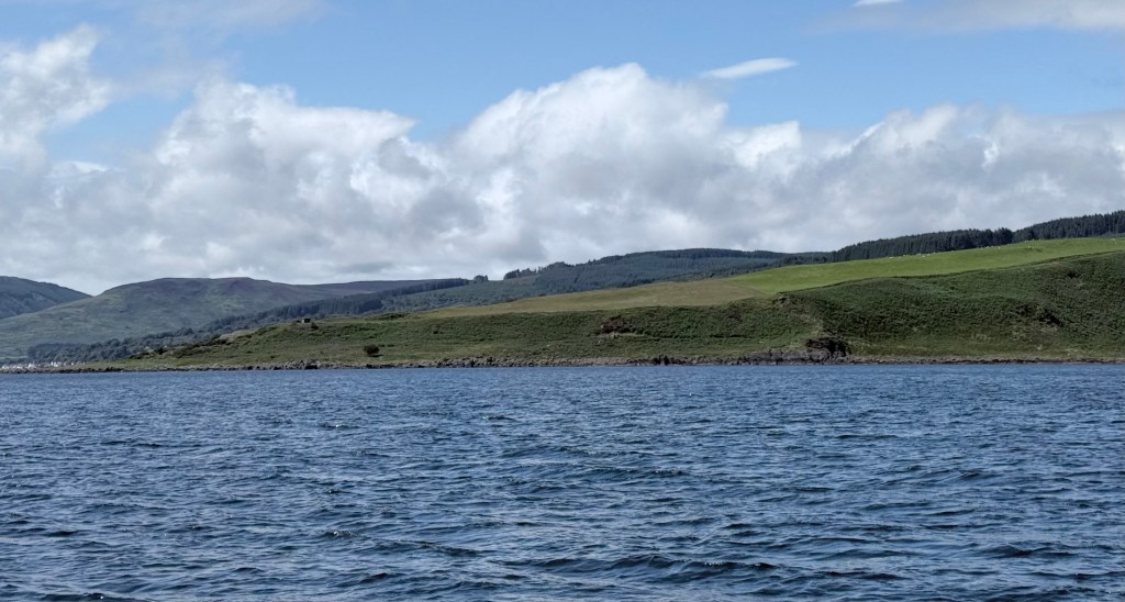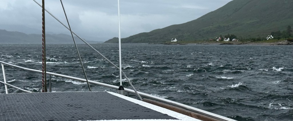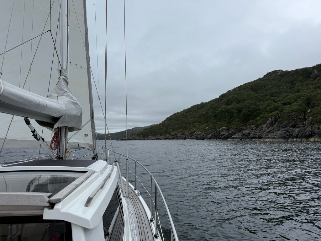 Lätt undanvind med stöttning av motorn ibland. Känner oss jagade av en ny regnfront och vill helst ha lagt till innan.
