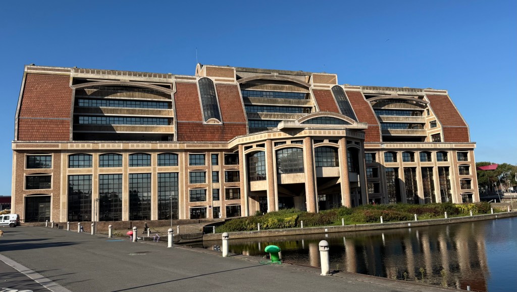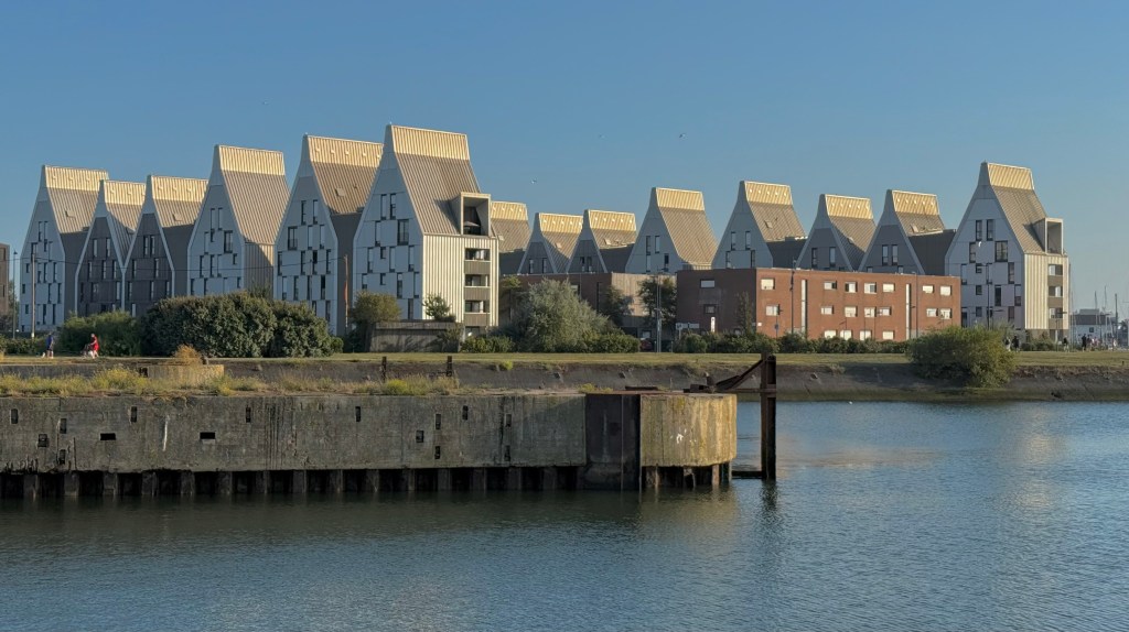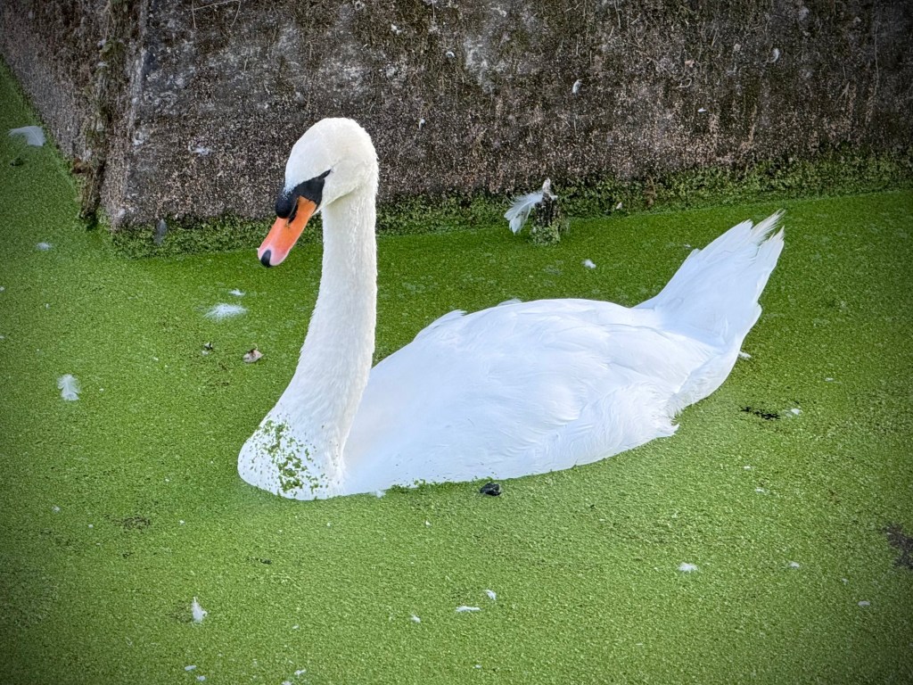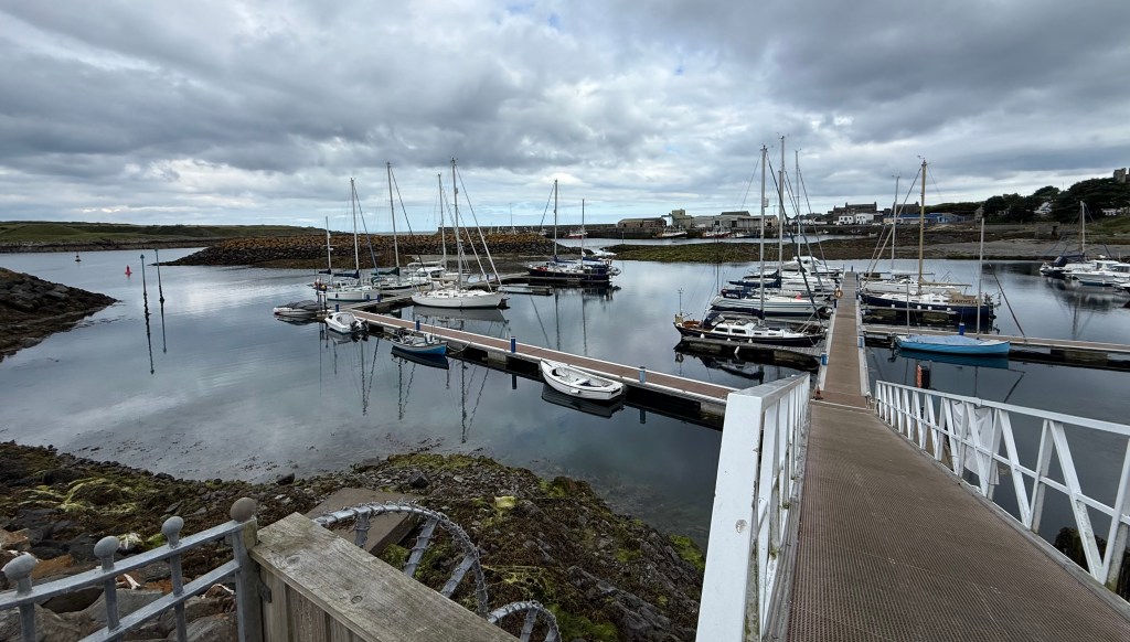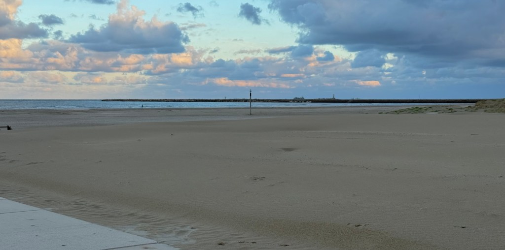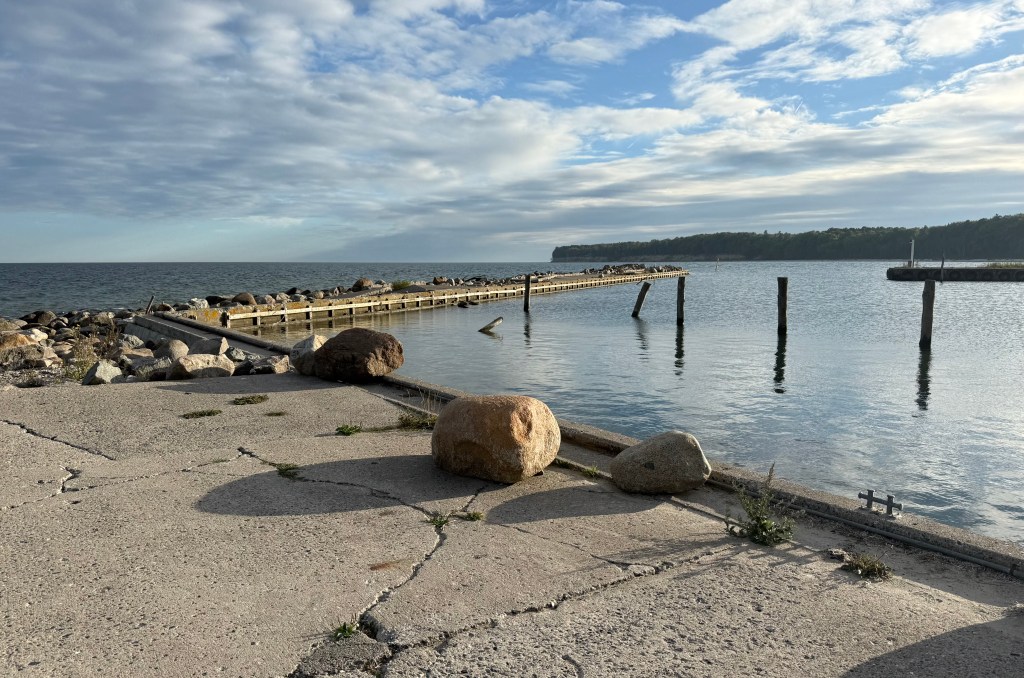 Samma vy som igår, men utan regn och vind. Endast dyningarnas dödskamp hörs på andra sidan. I hamnen är det stilla. Svanarna skapar små vågor när de simmar förbi.