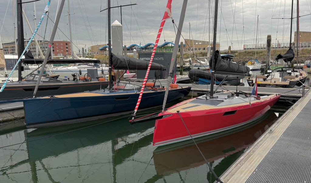 Vi ligger fortfarande i skugga men morgonljuset flödar in över piren. Denna Omega 42:a är bekant. Den har masthead rigg. Ovanlig för båttypen.