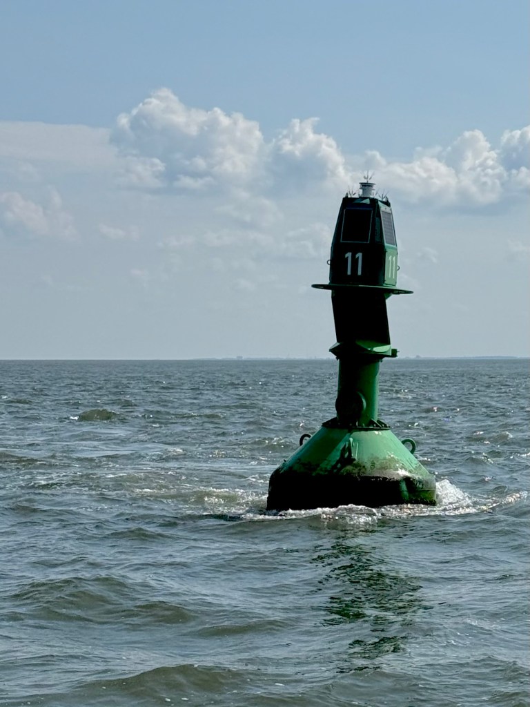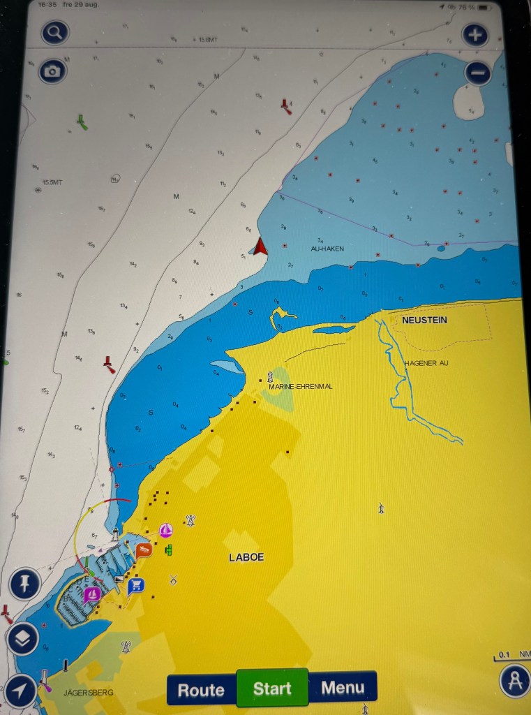 Ibland, som här vid inseglingen till hamnen, är det svårt att se sjömärkena som visar var vi ska segla. GPS:en är då en fantastisk tillgång.