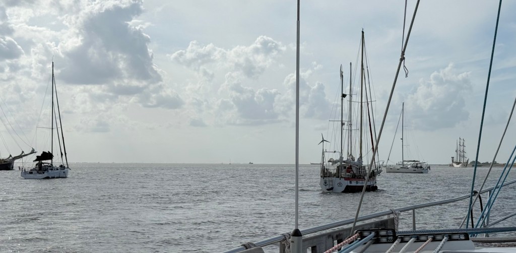 I lä av land och full solinstrålning började vi tina upp, även mentalt. Fyra segelbåtar, två tyska, en holländare och så vår ”racer för dagen” Panta.