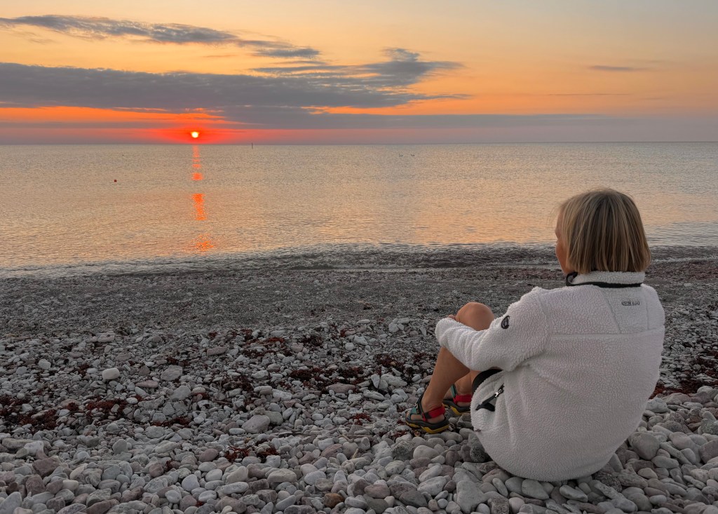 Nu är vi ensamma på plats och njuter av kvällens sol. Den ger inte bara ljus, utan även värme och batteriladdning.