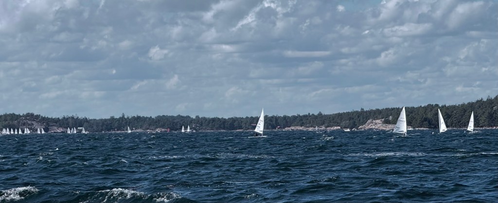 Vi närmar oss Vinterklasen med 7 knop och blir ifattseglade av dessa tävlande jollar. Kan det vara ILCA (Laserjollar)?